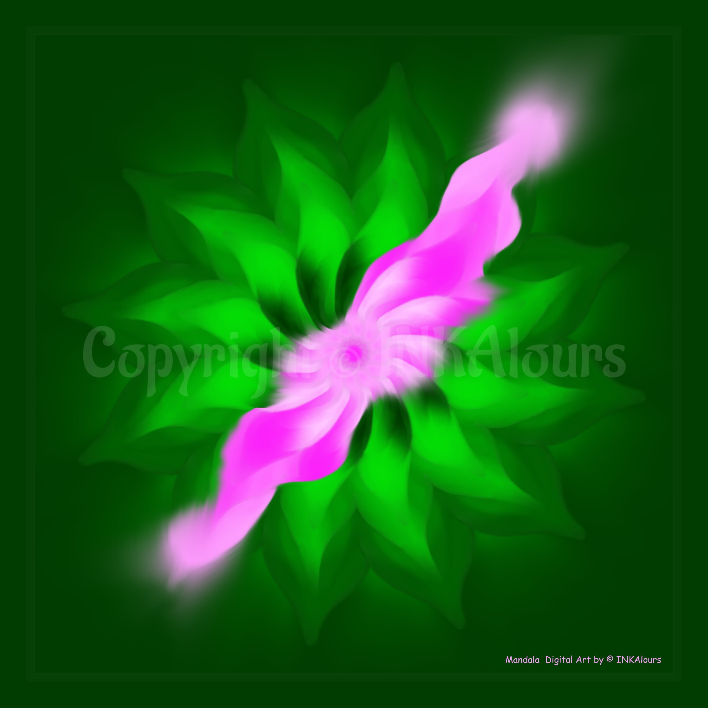 Mandala Pohled skrz je tvořena převážně různými odstíny zelené, což vytváří pocit přirozené krásy a rovnováhy. Ve středu této mandaly je šikmá skulina / rozdělení. Tento průzor působí jako nápadný ústřední bod, rozdělující mandalu na dvě odlišné části. V rámci tohoto centrálního rozdělení je středem pozornosti růžová barva. Přítomnost růžové uprostřed moře zeleně vytváří ostrý a vizuálně poutavý kontrast. Zelená ve vnějších oblastech mandaly znamená růst, obnovu a spojení s přírodou. Představuje bujnost světa kolem nás a symbolizuje harmonii a rovnováhu. Odstíny zelené navozují pocity klidu a vyrovnanosti. Růžová ve skulině ve středu mandaly poskytuje kontrastní a podnětný prvek, který symbolizuje lásku, něhu a soucit. Její přítomnost naznačuje hlubší vrstvu emocí nebo vhledu.